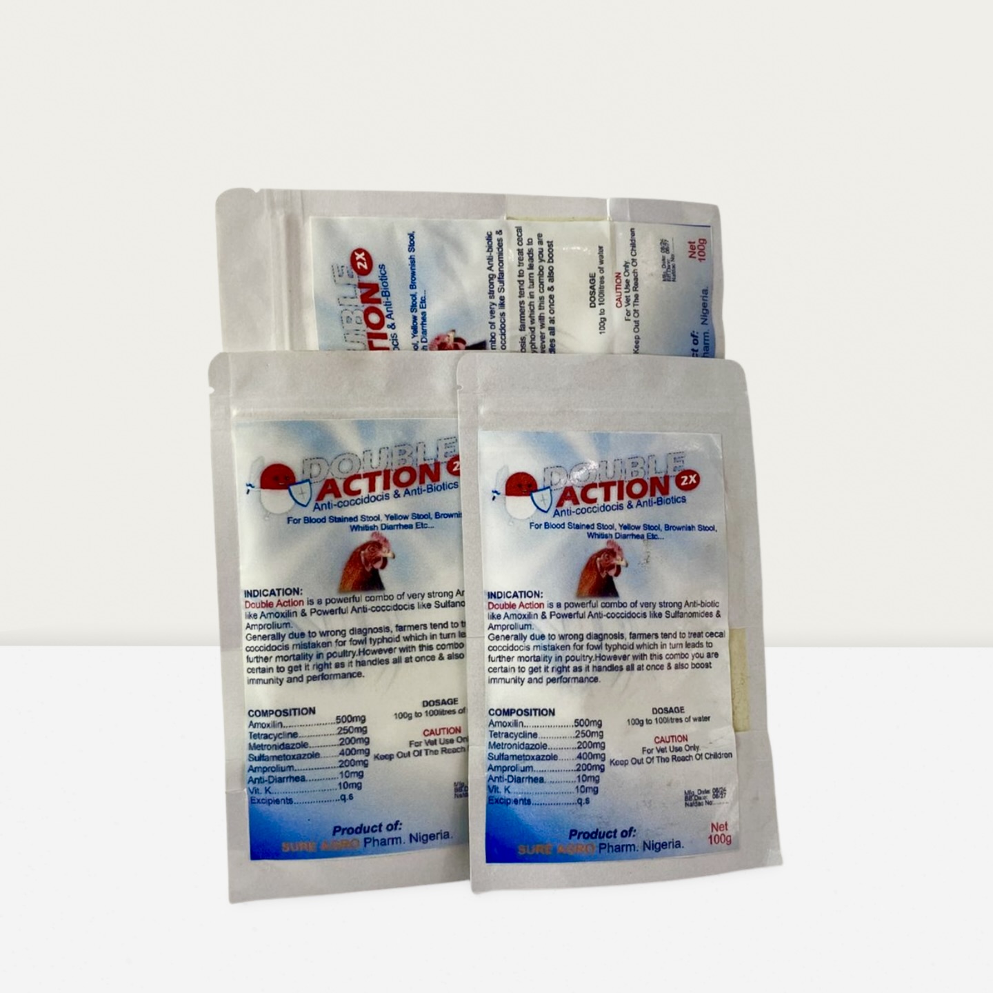 Double Action is a powerful combo of very strong Anti-biotic like Amoxilin & Powerful Anti-coccidocis like Sulfanomides & Amprolium.